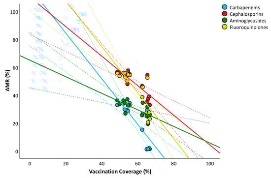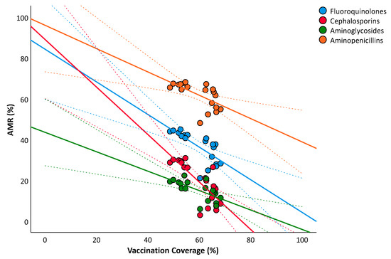 We also tested the linear relationship between influenza vaccination coverage in the overall population and AMR of E. coli and K. pneumoniae. Regarding E. coli, the analysis confirmed a significant and negative relationship with the percentages of resistance to aminoglycosides (β = −0.789; SE = 0.251; p = 0.010), third-generation cephalosporins (β = −1.401; SE = 0.262; p < 0.001), fluoroquinolones (β = −1.085; SE = 0.254; p = 0.002), and aminopenicillins (β = −0.608; SE = 0.253; p = 0.037), after adjusting for covariates.