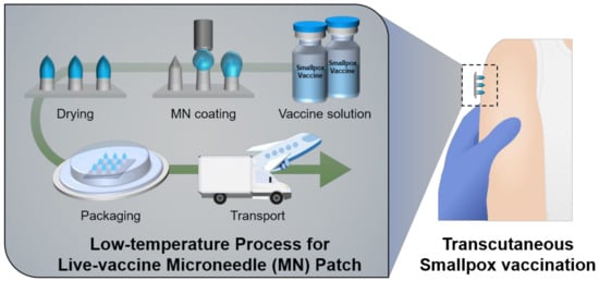 - Choi, I.J.; Cha, H.R.; Hwang, S.J.; Baek, S.K.; Lee, J.M.; Choi, S.O. Live Vaccinia Virus-Coated Microneedle Array Patches for Smallpox Vaccination and Stockpiling. Pharmaceutics 2021, 13, 209. [Google Scholar] [CrossRef] [PubMed]