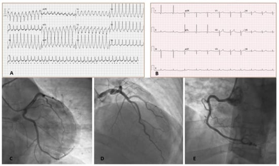 Electrocardiograms (EKG) on presentation. (A) EKG on presentation showing monomorphic ventricular tachycardia. (B) EKG after cardioversion showing sinus rhythm with poor R wave progression in precordial leads without significant PR or ST segment changes. Left heart Catheterization (C–E) show normal coronary arteries. (Table 1B).