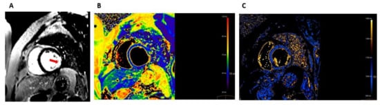 Cardiac MRI (1.5T) at presentation. (A) A short axis view of late gadolinium enhancement (LGE) image showing transmural LGE in the lateral and inferolateral wall (red arrow). (B) A T2 mapping image showing myocardial edema with regionally increased T2 values (78 milliseconds) in the lateral and inferolateral wall. (C) A T1 mapping image showing myocardial injury with increased native T1 values (1288 milliseconds) in the lateral and inferolateral walls.