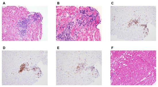 Histopathological Findings from Endomyocardial Biopsies. Hematoxylin-eosin stains of heart-tissue specimens showed inflammatory infiltrates composed of mononuclear cells with foci of severe interstitial edema and multifocal cardiomyocyte damage consistent with the diagnosis of definitive acute myocarditis (Panels A and B). Immunostaining demonstrated predominant inflammatory infiltration of lymphocytes (Panel C, CD3 immunostaining for T-lymphocytes, and Panel D, CD20 immunostaining for B-lymphocytes) and, to a lesser extent, macrophages (Panel E, CD68 immunostaining). A repeated endomyocardial biopsy 3 months later showed a complete resolution of myocarditis without evidence of inflammation or cardiomyocyte damage (Panel F, hematoxylin-eosin stains). Original magnification, ×200; scale bars, 100 µm (Panels A, and D–F) and original magnification, ×400; scale bars, 50 µm (Panel B).