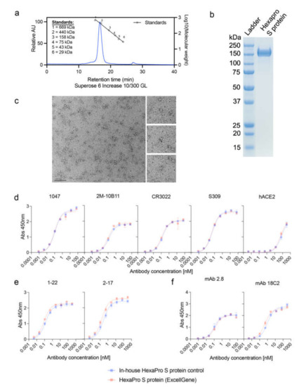 The biophysical characterization of SARS-CoV-2 HexaPro S protein was conducted using SDS-PAGE analysis (4–12% NuPage™ SDS gel, ThermoFisher, Victoria, Australia) and size-exclusion chromatography (SEC) on a Superose 6 Increase 10/300 GL column (Cytiva, Marlborough, MA, USA) with Gel Filtration Calibration Kits containing a mixture of proteins (thyroglobulin, ferritin, aldolase, conalbumin, ovalbumin, carbonic anhydrase, Cytiva, Marlborough, MA, USA) as standards. The accuracy of the antigenic structure of HexaPro S protein was probed by indirect enzyme-linked immunosorbent assay (ELISA) using a panel of S-specific monoclonal antibodies (1047, 2M-10B11, CR3022, S309, hACE2, 2-17, 1-22, mAb 2.8, and mAb 18C2) [47,48,49,50,51,52].