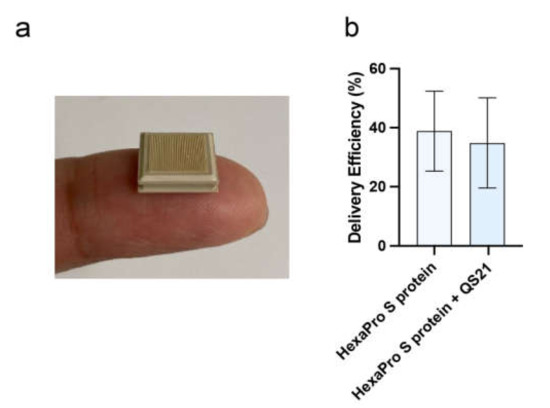 HexaPro S protein-based vaccine and its application using HD-MAP. (a) HD-MAPs containing 5000 solid polymer microprojection arrays to deliver vaccine into the cutaneous layer of the skin. (b) Delivery efficiency of antigen into the skin using HD-MAPs coated with SARS CoV-2 HexaPro S protein and QS-21-adjuvanted SARS CoV-2 HexaPro S protein (n = 5, each) was measured by comparing the remaining protein from the delivered HD-MAPs to undelivered HD-MAPs using capture ELISA.