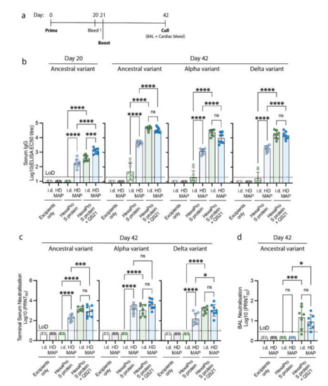 Immune responses in BALB/c mice following the vaccination with excipients (negative control), HexaPro S protein, and HexaPro S protein + QS-21 via intradermal injection (i.d.) or HD-MAP application (n = 8, each), (a) vaccination schedule. Serum was collected after primary immunization and first boost (on day 20 and 42, respectively) and analyzed for (b) serum IgG antibody titers against HexaPro S protein and HexaPro S protein derived from Alpha and Delta variants by ELISA. Serum and bronchoalveolar lavage (BAL) collected on day 42 were analyzed for (c) serum virus neutralization by plaque reduction neutralization test (PRNT) against the parental SARS-CoV-2 isolate, an Alpha variant, and a Delta variant, and (d) BAL virus neutralization by PRNT against ancestral SARS-CoV-2 variant, respectively. Each point represents an individual biological replicate (mouse) performed on a single ELISA assay; bars represent the average antigen-specific IgG antibody titers (EC50); error bars represent the SD; the LoD line represents the assay limit of detection. Statistical analysis was performed using one-way ANOVA with Tukey’s multiple comparison post hoc test ((*) p < 0.05, (***) p < 0.001, (****) p < 0.0001 and non-significant (ns)).