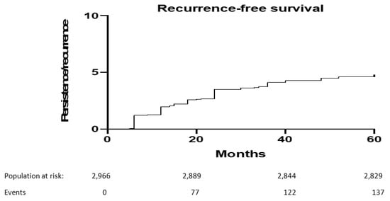 At 5-year of follow-up, 175 (6%) out of 2966 patients included developed a persistent/recurrent cervical dysplasia. Median (range) recurrence-free survival was 18 (5, 52) months. Figure 1 shows 5-year recurrence-free survival.
