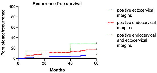 Diagnosis of CIN3 (instead of CIN2), presence of HR HPV types, positive endocervical margins, HPV persistence, and the omission of HPV vaccination after conization increased significantly (p < 0.05) and independently of the risk of developing cervical dysplasia persistence/recurrence. Figure 2 shows the risk of developing cervical dysplasia persistence/recurrence according to margin status (p = 0.002, log-rank-test).