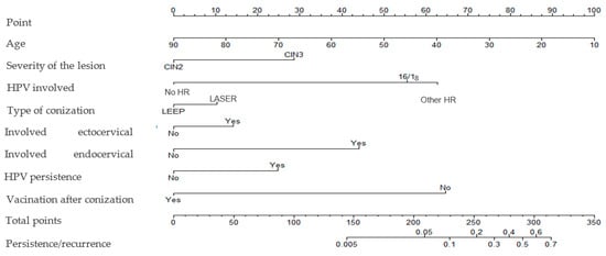 Nomogram assessing the risk of cervical dysplasia persistence/recurrence.