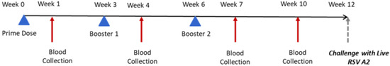 Immunization schedule. A prime dose of 5 µg of RSV-F VLP subunit vaccine was administered to mice on week 0, followed by a booster on weeks 3 and 6. Blood samples were collected and IgG titers were measured on weeks 1, 4, 7, and 10. Live RSV A2 virus challenge was induced intranasally on week 12.