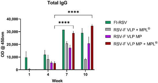 Total IgG measurement. RSV-F protein-specific antibody responses in mice. Mice received 1 prime and 2 booster doses of 5 µg/dose of F VLP transdermally and 1 µg/dose of FI-RSV (I.M.). The adjuvant group received 10 µg of MPL®. Serum samples collected at 1, 4, 7, and 10 weeks were analyzed for RSV-F protein-specific IgG using ELISA. Statistical significance was determined using two-way ANOVA in GraphPad Prism. Error bars represent standard error of the mean from individual animals. **** p < 0.0001.