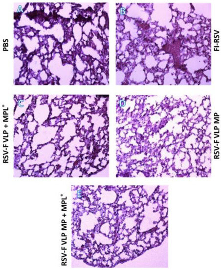 Lung tissues were collected from individual mice (n = 5 per group). Lung tissue sections were stained with hematoxylin and eosin (H&E) to assess inflammation. (A) PBS (control); (B) FI-RSV (I.M.); (C) RSV-F VLP + MPL® (T.D.) suspension; (D) RSV-F VLP MP (T.D.); (E) RSV-F VLP MP + MPL® (T.D.).