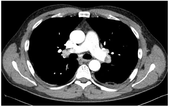 A 39-year-old man was referred to our intensive care ward at the University Hospital Regensburg in Germany after he presented to the emergency department of the referring hospital two days before with severe pain in the left thorax and upper abdomen. Ten days earlier, he received a single dose of the SARS-CoV-2 vaccine Ad26.COV2.S (Johnson & Johnson, New Brunswick, NJ, USA). The patient was healthy until day 8 post vaccination, had no medical history, did not take any medication, and had no family history of venous thromboembolism. However, the patient smoked approximately 10 cigarettes a day for approximately 20 years.