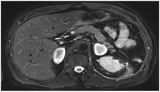 During the following days, the health status of the patient improved and five days later he could be discharged from the ICU. Intravenous anticoagulation via argatroban was changed to oral rivaroxaban. For follow-up, abdominal magnetic resonance imaging (MRI) was performed on day 10 (one day before discharge). In this imaging, analogous to the CT on day 9, adrenal lesions appeared marginally hyperintense and centrally hypointense in T2 weighting, consistent with haemorrhage (Figure 3). A short Synacthen test was performed 24 h after the last hydrocortisone dose. Cortisol levels were 1.8 µg/dL, 1.9 µg/dL, and 2.0 µg/dL (aim > 22 µg/dL) at 0, 30, and 60 min after ACTH (adrenocorticotropic hormone) administration, respectively, confirming the diagnosis of primary adrenocortical insufficiency. Therapy with 30 mg hydrocortisone and 0.05 mg fludrocortisone per day was continued. The patient was discharged from the hospital on day 22 with normal platelet counts and in good health.