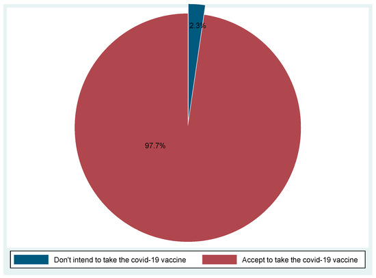 The majority, 97.6% (95% CI 95.9–99.4), of the eye healthcare workers in Uganda accepted and were willing to take the COVID-19 vaccine. The prevalence of vaccine hesitancy was 2.3% (95% CI 0.6–4.1) (Figure 1).