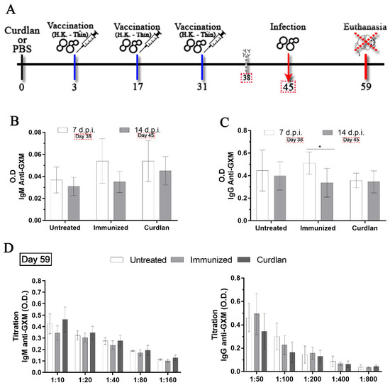 Immunotherapeutic approaches using immunostimulatory agents or vaccines based on the cell wall structure of Cryptococcus spp. and/or its cytoplasmic components have shown positive effects against cryptococcosis [39,71,72]. An immunization strategy, which uses the specific antigens from C. neoformans and Dectin-1 ligand-coated particles, has shown potential for use against C. neoformans infection [73]. Therefore, we developed an immunization protocol using the selective Dectin-1 receptor agonist, curdlan, to stimulate innate immune cells and induce an efficient cellular and humoral immune response against C. gattii. BALB/c mice were divided into three groups: (i) untreated group (PBS only at all stages of the immunization protocol); (ii) immunized group (immunization with 2 × 107 HK-C. gattii-thin yeast cells, i.n.); and (iii) curdlan group (immunostimulation with 200 µg/mouse i.p. of curdlan prior to immunization with 2 × 107 HK-C. gattii-thin yeast cells, i.n.). On day zero, BALB/c mice were either immunostimulated with curdlan or not and, after three days, they were immunized with HK-C. gattii-thin. Additionally, two booster doses were administered at an interval of two weeks, on days 17 and 31 (Figure 1A). After 7 and 14 d.p.i., a blood sample was collected from each animal and used to measure the levels of serum IgM and IgG anti-GXM antibodies (Figure 1B,C). Mice immunized with HK-C. gattii-thin only showed a significant reduction in the levels of IgG anti-GXM at 14 d.p.i. compared to 7 d.p.i. (Figure 1C). However, there were no significant differences in the levels of IgM anti-GXM in any groups during the observation period (Figure 1B). Thereafter, the mice were inoculated (i.n.) with 1 × 105 C. gattii yeast cells on day 45, and after two additional weeks (day 59), they were euthanized for analysis (Figure 1A).