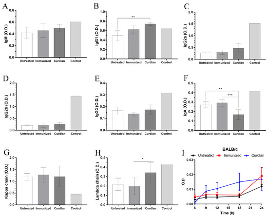 Isotyping of serum immunoglobulins in BALB/c mice and the effect of serum on the growth curve of C. gattii cultivated in titan cell medium (TCM). BALB/c mice immunostimulated with curdlan and/or immunized with HK-C. gattii-thin were euthanized 14 days post infection with C. gattii. The serum was collected and used for both isotyping the immunoglobulins and incubating with C. gattii to determine its growth curve. The (A) IgG1, (B) IgG2a, (C) IgG2b, (D) IgG3, (E) IgM, (F) IgA isotypes, and the (G) kappa and (H) lambda light chains were evaluated. (I) C. gattii R265 was cultivated at 37 °C for 24 h in TCM, and the growth curves were determined in the presence of serum from mice belonging to the untreated (black circle), immunized (red square), and curdlan groups (blue triangle). The results are expressed as mean ± SD. * p < 0.05, ** p < 0.01, and *** p < 0.001.