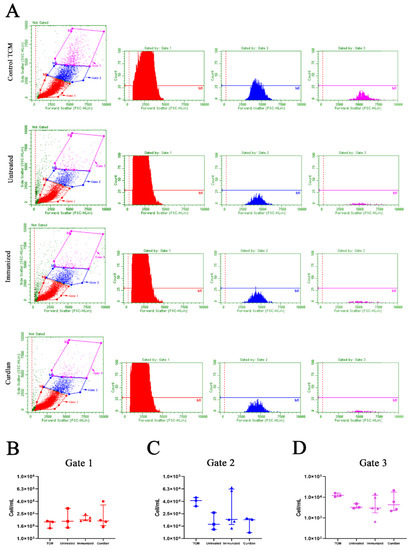 To evaluate whether the serum proteins from mice affected the growth and morphological transition of C. gattii yeasts to titan cells, we measured the optical density (OD) to generate a growth curve, and titan cell formation was determined using flow cytometry. The serum from mice in the different groups was incubated in vitro with C. gattii, and the absorbance at 540 nm after 6, 9, 12, 18, and 24 h of incubation (Figure 2I) was measured. The results demonstrated that incubation with serum from untreated, immunized, or curdlan groups did not decrease the growth of C. gattii (Figure 2I). Next, we cultured C. gattii in TCM and observed a marked reduction in its growth rate (Figure S1A). However, we observed increased numbers of C. gattii cells with a large size (Figure S1B–E) after cultivation in TCM compared to that after incubation in SD. This evaluation was standardized by flow cytometry (Figure 3A). The cell suspension was separated into three homogeneous populations, with distinct cell sizes considered within each gate and replicated for all groups analyzed (Figure S2). Our results showed that the serum obtained from untreated, immunized, or curdlan groups had no effect on the concentration of C. gattii cells grown in TCM (Figure 3B–D). Then, the formation of titan cells of C. gattii was not affected by the serum from mice treated with or without adjuvant curdlan.