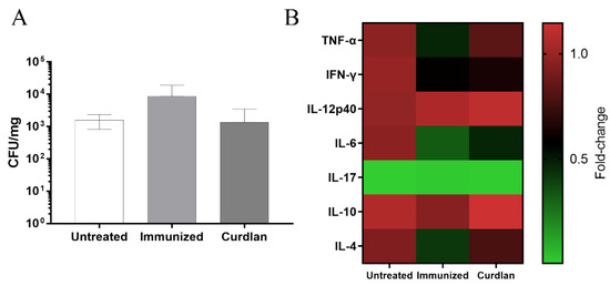 The binding of β-glucan to the Dectin-1 receptor promotes the innate immune response and results in the secretion of a range of cytokines [74]. It is important to highlight that the host immunity, both cell-mediated and humoral, is essential for managing Cryptococcus infections [75,76]. Therefore, the host’s immune response at the site of infection was evaluated after immunization with or without adjuvant curdlan. To measure the immune response, a lung fragment was homogenized, and the supernatant was used to measure the levels of pro- and anti-inflammatory cytokines, such as TNF-α, IFN-γ, IL-12p40, IL-6, IL-17, IL-10, and IL-4 (Figure 4B). The curdlan group showed an increase in the levels of TNF-α compared to the group that was only immunized (Figure 4B). Nevertheless, the immunized group showed a reduced level of TNF-α compared to that in the untreated group (Figure 4B and Figure S3A). BALB/c mice that received curdlan showed reduced levels of IFN-γ compared to those from the untreated group (Figure 4B and Figure S3B). The levels of IL-12p40, IL-6, IL-17, and anti-inflammatory cytokines did not differ significantly among the groups (Figure 4B and Figure S3C–G). These findings demonstrate that the adjuvant curdlan prevented a decrease in the TNF-α levels induced after HK-C. gattii-thin administration but was not able to reduce the C. gattii burden in the lungs of mice.