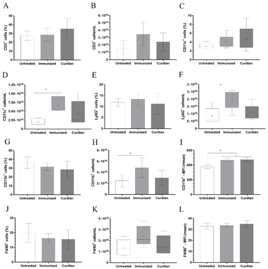 Phenotyping of the leukocytes in the lungs of mice treated with curdlan and immunized with HK-C. gattii. After administration of curdlan or PBS, the mice were immunized with HK-C. gattii-thin and infected with viable C. gattii. The lungs of the infected mice were harvested at 14 days post infection. Pulmonary leukocytes were obtained by dissociating the tissue with collagenase. The cell suspensions were used to determine the frequency (%) and concentration (cell/mL) of T lymphocytes (A,B), CD11c+ (C,D), Ly6G+ (E,F), CD11b+ (G,H), and F4/80+ (J,K). The mean fluorescence intensity (MFI) of (I) CD11b+ and (L) F4/80+ cells was recorded using flow cytometry. The relative and absolute frequencies of these cells were determined in the lung samples. The results are expressed as both, in percentage and cells/mL, and are represented as mean ± SD or as median with maximum and minimum values. Comparisons were made between groups for the same period of infection. * p < 0.05.