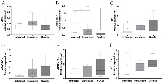 The administration of curdlan in different experimental models has facilitated the differentiation of T cells towards the Th1 and Th17 profiles [56,57,58]. Additionally, we observed that using curdlan as an adjuvant significantly increased TNF-α levels in the lung tissue. TNF-α is a pro-inflammatory cytokine that facilitates the polarization of macrophages towards the M1 phenotype. Oliveira-Brito et al. had previously demonstrated that Arginase-1 expression is elevated in BALB/c mice after 14 days of infection with C. gattii [69]. Here, we used the same period of infection as that established by Oliveira-Brito et al. [69] and screened for the key transcription markers that are associated with innate and adaptive immunity cells (Figure 6A–F). Curdlan treatment promoted a reduction in the relative expression of Arginase-1 when compared to the untreated group (Figure 6B). Moreover, there was no difference in the relative expressions of iNOS, T-bet, GATA-3, ROR-γt, and FOXP3 among the groups (Figure 6A,C–F). Thus, the immunostimulation induced by curdlan reduced the relative expression of Arginase-1 in the lung tissue of BALB/c mice that were challenged with C. gattii; however, it was unable to directly influence the differentiation of T helper cells towards the Th1 and/or Th17 profiles.