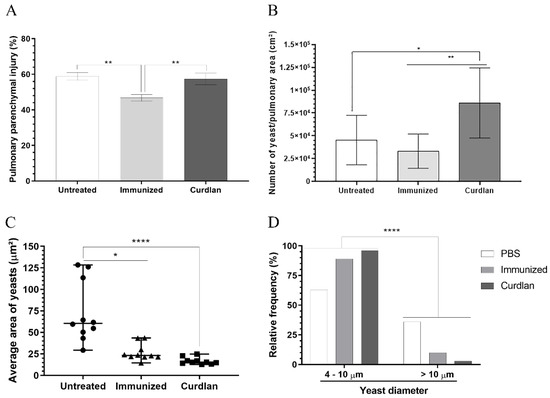 Morphometric analysis of the lung tissue in BALB/c mice treated with curdlan, immunized with HK-C. gattii, and infected with viable C. gattii. Lungs were perfused with PBS and harvested from the BALB/c mice 14 days post infection. Lung fragments were fixed with methacarn, dehydrated in an alcohol battery, diaphanized with xylol, and embedded in paraffin. Serial 5 µm cuts were made and stained with Grocott-Gomori methenamine silver (GMS). (A) Pulmonary parenchyma injury (%), (B) quantification of the number of yeast cells/pulmonary area (cm2), (C) average yeast cell area (µm2), and (D) yeast relative frequency were evaluated in a semi-automated quantitative way using ImageJ Fiji. The data were analyzed using the X2 test (Goodness-of-fit test). Values were expressed as mean ± SD. * p < 0.05, ** p < 0.01, and **** p < 0.0001.