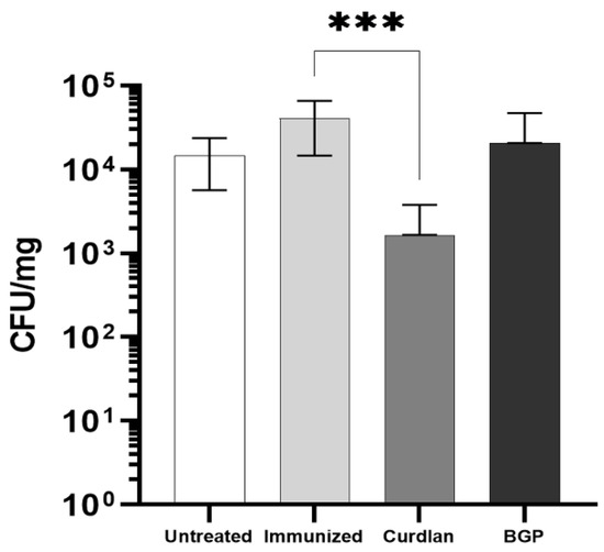 Quantification of the pulmonary fungal burden in C57BL/6 mice subjected to the HK-C. gattii immunization protocol, with or without the administration of curdlan. C57BL/6 mice received curdlan (200 μg/mouse), BGP (200 μg/mouse), or PBS i.p. on day 0. On days 3, 17, and 31, they were immunized with 2 × 107 HK-C. gattii-thin yeast cells or administered PBS i.n., with an interval of 14 days between immunizations. On day 45 (14 d.p.i.), the mice were infected with C. gattii. On day 59 (14 days post infection), the mice were euthanized, and the pulmonary fungal burden was quantified using the CFU (colony-forming units) assay and normalized to the lung mass (CFU/mg). The results are expressed as mean ± SD. *** p < 0.001.