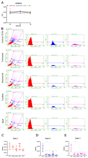Evaluation of the growth and concentration of C. gattii cells cultured in TCM and incubated with serum from C57BL/6 mice treated with the Dectin-1 ligand. C57BL/6 mice that had received curdlan, BGP, or PBS were immunized with HK-C. gattii-thin before being challenged with C. gattii. Serum was collected after 14 days of infection and incubated with C. gattii in TCM. (A) C. gattii R265 was cultured at 37 °C for 18, 21, and 24 h in TCM, and the growth curves were determined in the presence of serum from untreated (black circle), immunized (red square), curdlan (blue triangle), and BGP groups (green triangle). (B–E) After 24 h of incubation, C. gattii was analyzed by flow cytometry. The cell size and concentration of the three populations as defined by gates 1 (red; (B,C)), 2 (blue; (B,D)), and 3 (pink; (B,E)) were measured. Cell concentration is expressed in cell/mL. Results are expressed as mean ± SD, or as medians, and maximum and minimum values. * p < 0.05.