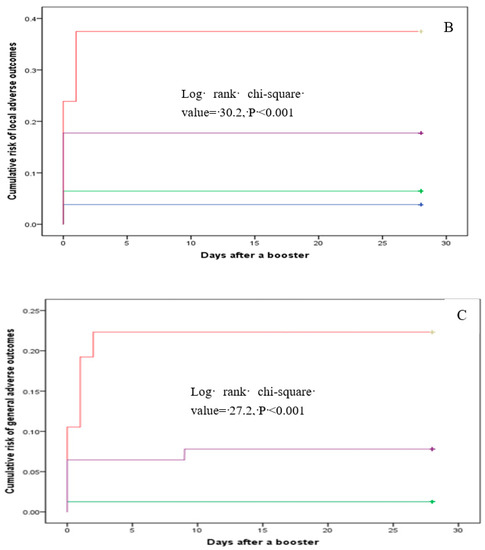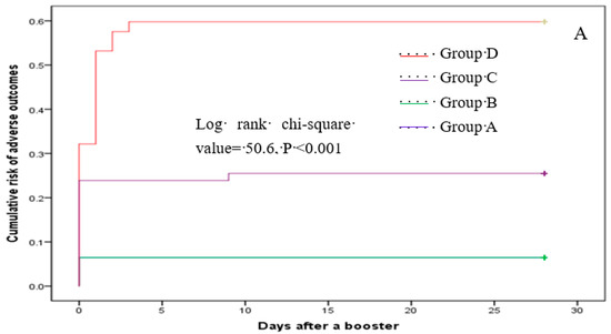 Multinomial logistic regression analysis indicated that, compared with subjects in group B, the risk of having one reaction after the booster was higher in groups C and D, with an adjusted OR of 7.8 (95% CI: 2.46–24.68) and 4.69 (95% CI: 1.45–15.17), respectively (Table 6). Participants in group C also had an increased likelihood of reporting ≥two adverse reactions relative to those in group B. However, these risks for group D participants did not differ significantly from those in group B (Table 6). The cumulative risk of total, injection site, and systemic reactions varied across the four groups (all log-rank p values < 0.001) (Figure 2).