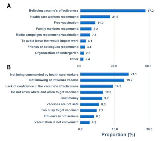 In addition, 47.2% of respondents who self-reported the intention for their children to receive IV believed that influenza vaccines provide protection for their children, while 21.6% of respondents self-reported an intention for IV because the influenza vaccine was recommended by their doctors, and 11.0% of respondents self-reported an intention to receive IV on the condition that the influenza vaccines are free. Recommendation from doctors and knowledge about the influenza vaccine were found to be the most effective factors for increasing the intention for IV. Overall, 21.1% of respondents self-reported that their children would not receive IV because their doctors did not recommend it, whereas 19.2% had not heard about the influenza vaccine, and 14.3% believed that the influenza vaccine does not offer effective protection. In addition, the cost and convenience of vaccination were also found to be important factors (Figure 1).