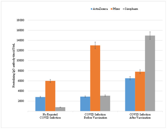 The effect of COVID-19 infection on the mean titer of neutralizing IgG antibodies in HCWs vaccinated with three main types of vaccines.