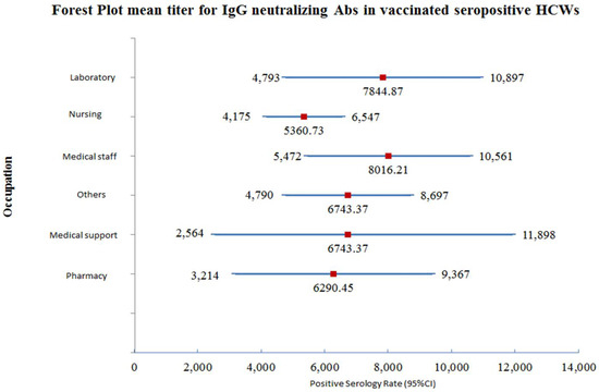 Out of the 510 participants, 24 participants had insufficient data and out of the remaining 486 participants, there were 43 who were laboratory pathologists and medical technologists. Their mean titer was 7844.87 AU/mL, with a 95% confidence interval (4793.11–10,896.62). The mean titer of the neutralizing IgG antibody in 180 nursing staff was 5360.73 AU/mL, with a 95% confidence interval (4174.80–6546.66). The number of medical staff who were tested was 98 and their mean titer of neutralizing IgG antibody was 8016.22 AU/mL, with a 95% confidence interval (5471.64–10,560.80). There were 22 medical support staff participants and their mean titer antibody after vaccination was 7231.35 AU/mL, with a 95% confidence interval (2564.22–11,898.47). The number of participating pharmacists was 30, and the mean titer of the protective neutralizing IgG antibody developed was 6290.45 AU/mL, with a 95% confidence interval (3214.32–9366.58). The remaining HCWs in the study were 113, and their mean titer of protective neutralizing IgG antibody was 6743.37 AU/mL, with a 95% confidence interval (4790.05–8696.70). A forest plot for the mean titer and range for neutralizing antibody titer is illustrated in Figure 2.