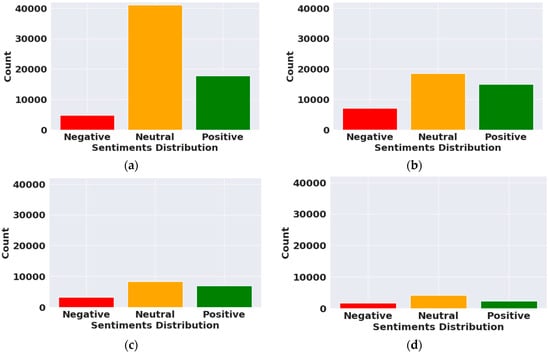 Distribution of COVID-19 vaccine sentiments: (a) Sentiment distribution of Covaxin; (b) sentiment distribution of Moderna; (c) sentiment distribution of Pfizer; (d) sentiment distribution of Sinopharm.