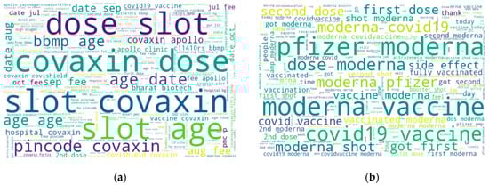 Figure 1a represents the sentiments of people about the COVID-19 Covaxin vaccine. Most of the sentiments are neutral. In total, 28% of tweets about Covaxin are positive and only 8% are negative. Figure 1b represents the sentiments of people about the COVID-19 Moderna vaccine. People’s sentiments about Moderna are 46% neutral, 37% positive, and 17% negative. Similarly, Figure 1c,d represent the sentiments about Pfizer and Sinopharm, respectively. People’s sentiments about the Pfizer vaccine are 45% neutral, 38% positive, and 17% negative. Tweets related to Sinopharm are 52% neutral, 28% positive, and 20% are negative. The vaccines elicited different feelings among people, as Raghupathi et al. demonstrate in their study, where people were concerned about receiving newly developed vaccines [23]. These statistics show that people’s sentiments about Covaxin are more positive as compared to Moderna, Pfizer, and Sinopharm. Moderna ranks second in terms of positive sentiments. The sentiments related to each vaccine are mostly neutral and positive, and in another study, Paul et al. found that only 14% of respondents had negative attitudes towards vaccines [26].