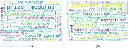 Word cloud of four different COVID-19 vaccines: (a) word cloud of Covaxin-related tweets; (b) word cloud of Moderna-related tweets; (c) word cloud of Pfizer-related tweets; (d) word cloud of Sinopharm-related tweets.