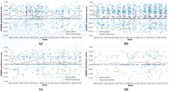 Different COVID-19 vaccines’ sentiment distribution over time and rolling mean: (a) Covaxin sentiment distribution over time and rolling mean; (b) Moderna sentiment distribution over time and rolling mean; (c) Pfizer sentiment distribution over time and rolling mean; (d) Sinopharm sentiment distribution over time and rolling mean.