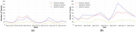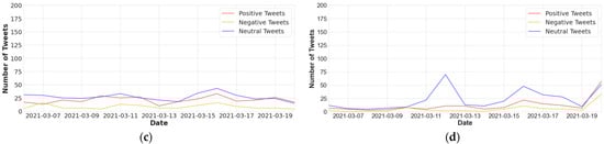 Figure 3 shows the sentiment distribution over time, and the red line represents the moving average of fourteen days. We also calculated the proportion of tweets for every type of sentiment (See Figure 4). We plotted the frequency of all four vaccines’ positive, negative, and neutral sentiments on a graph from 6 March 2021 to 20 March 2021. During this duration, the number of positive, negative, and neutral tweets related to Covaxin was 477, 172, and 452, respectively. The number of positive, negative, and neutral tweets related to Moderna was 675, 301, and 855, respectively. Similarly, for Pfizer, the number of positive, negative, and neutral tweets was 290, 128, and 372, respectively. Further, for Sinopharm, 186, 60, and 321 were the frequency of positive, negative, and neutral tweets, respectively. These statistics show that Moderna’s positivity rate was high from 6 March 2021 to 20 March 2021 as compared to the other vaccines. The total number of Moderna tweets was also high during this period.