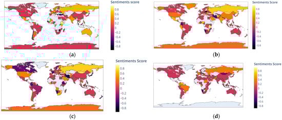 Heat map of four COVID-19 vaccines’ sentiment scores by country: (a) heat map of Covaxin; (b) heat map of Moderna; (c) heat map of Pfizer; (d) heat map of Sinopharm.