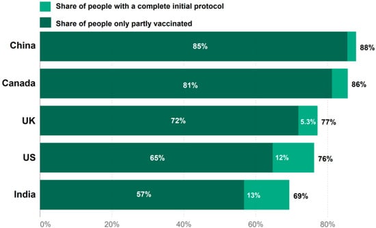The average mean of the sentiments related to the four COVID-19 vaccine is shown in Table 4, and the vaccine coverage in the mentioned five countries (India, USA, Canada, UK, and China) is shown in Figure 6. Table 4 shows that the average sentiment score of Covaxin was 0.0046, with 24,313 tweets in India. The USA had the lowest average sentiment score (−0.0007), with 4632 tweets related to Moderna. The Moderna vaccine had the highest average sentiment score of 0.0551, with 71 tweets in China. The Analysis of Variance (ANOVA) [46] and Tukey (CI = 95%) [47] methods were used to examine differences in the sentiments of these five countries. These methods showed that India and China, the USA and China, Canada and China, and the UK and China had differences of 0.2061, 0.1816, 0.0805, and 0.2031 in sentiments related to the Covaxin vaccine, respectively. In the case of the Moderna vaccine, a large statistical difference of 0.0923 in sentiments was present between India and China. There was a large statistical difference of 0.0356 present between the USA and Canada in the case of the Pfizer vaccine. The statistical difference (0.1422) in the case of the Sinopharm vaccine was large between India and Canada.