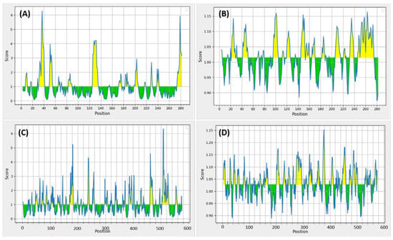 The analysis provided 20 peptides with antigenicity above the average and a threshold value of 1.027 with the minimum score being 0.889 for the residues of phytoene dehydrogenase (Figure 1A). This prediction was fascinating as the majority of the peptides demonstrated an antigenic potential. The results were duplicated for the hypothetical protein residues, which averaged an antigenicity score of 1.014 with the maximum score being 0.874 and the maximum being 1.164, provided in Figure 1B. The flexibility, β-turn, and hydrophilicity analyses predicted 416 epitopes based on flexibility and 576 epitopes based on β-turn and hydrophilicity, respectively, for the phytoene dehydrogenase residues. Fifty percent of phytoene dehydrogenase residues in all the graphs were satisfying the threshold values. For the hypothetical protein, 281 residues based on flexibility and 282 based on β-turn and hydrophilicity were calculated. According to surface accessibility, which was selected as an important factor for analyses, based on predictions of epitopes that are easily accessible (present) on the surface of the target proteins, 13 peptides from phytoene dehydrogenase and 6 for the hypothetical protein were provided, with the average scores being 1.000 for both proteins (Figure 1C,D).