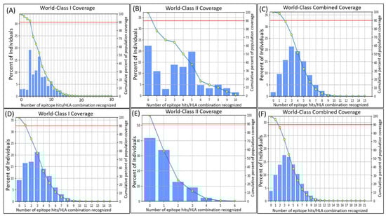 (A) World coverage of phytoene dehydrogenase’s selected epitopes for MHC-I class. (B) World coverage of phytoene dehydrogenase’s selected epitopes for MHC-II class. (C) World coverage of selected epitopes of phytoene dehydrogenase for both MHC classes. (D) World coverage of hypothetical protein’s selected epitopes for MHC-I class. (E) World coverage of hypothetical protein’s selected epitopes for MHC-II class. (F) World coverage of hypothetical protein’s selected epitopes for both MHC classes.