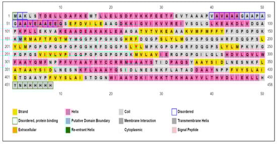 The primary sequence of the vaccine construct was subjected to secondary structure analysis on PSIPRED [] (http://bioinf.cs.ucl.ac.uk/psipred/ (accessed on 28 July 2021) and Scratch [] (http://scratch.proteomics.ics.uci.edu (accessed on 28 July 2021). Sequence data of the vaccine in FastA format were inputted in the required box. The prediction of secondary structure by PSIPRED 4.0, prediction of disordered regions by DISOPRED3 [], prediction of membrane helices by MEMSTAT-SVM [], prediction of domains by DomPred [], 3D structure prediction based on domain folding by DMPfold 1.0 [], and contact prediction by DeepMetalPSICOV 1.0 [] was analyzed using the server. For scratch-assisted prediction, a plain sequence of the vaccine with no headers was provided to the server, and its secondary structure, disordered regions, solvent accessibility, disulfide bonds, and antigenicity were predicted.