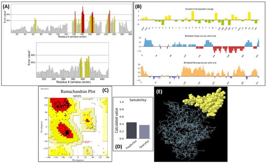 Physicochemical properties of the vaccine; (A) ERRAT score of the vaccine construct, (B) RC plot of the vaccine construct predicting the secondary structure, (C) vaccine solubility as compared with the reference E. coli solubility index, (D) tertiary structure of the vaccine’s discontinuous epitopes, and (E) solubility index along with fold propensity for the vaccine construct.