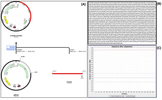 (A) Cloning process of vaccine into pBR322, (B) refined sequence according to codon optimization, (C) codon adaptation postoptimization.