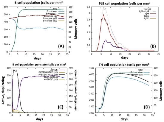 B- and T-cell populations upon vaccine injection: (A) antibody isotopes produced and activated in response to the vaccine, (B) PLB cells’ response against vaccine, (C) B-cell response per state, (D) helper T-cell response against the vaccine.