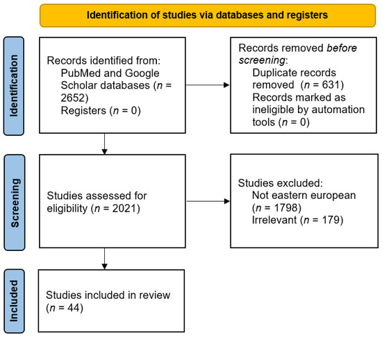 We initially reviewed 2652 studies (1297 on PubMed/Medline and 1355 on Google Scholar) conducted between December 2020 and January 2022. After excluding duplicate titles, 2021 studies conducted worldwide remained. Of these, 517 were conducted in Europe, and among these, 223 were conducted in Eastern European countries. After excluding reviews, reports, current opinions, and studies irrelevant to our objectives, we selected 44 cross-sectional studies that address the motivation for hesitance toward COVID-19 vaccination.