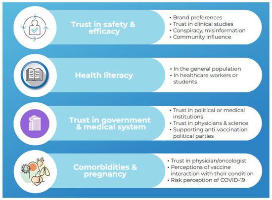 Each of these determinants is discussed below, along with possible improvement measures. Variables specific to Eastern Europe that predict the willingness to vaccinate have also been highlighted. Several studies explored the hesitancy toward COVID-19 vaccination in Eastern European populations with comorbidities or pregnancy [20,21,22,23,24,25,26].