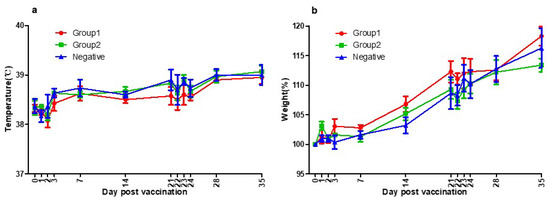 (a) Three groups’ temperatures of the day post-vaccination. Group1 (●), Group2 (■), and Negative Group (▲) showed the same patterns of body temperature. They were all within the normal range. As a result of temperature measurements, there was no side effect of the vaccines. (b) Three groups’ body weights of the day post-vaccination. Group1 (●), Group2 (■), and Negative Group (▲) showed the same patterns of growth rate. They were all within the normal range. As a result of bodyweight measurements, there was no side effect of the vaccines.