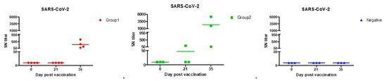 SARS-CoV-2 neutralization antibody forming rates with each of the beagles. Both Group 1 (●) and Group 2 (■) had sufficient antibodies against SARS-CoV-2 infection in second vaccination. According to previous studies, the antibody produced in vaccinated persons, asymptomatic, and symptomatic patients had an SN titer of up to 160.