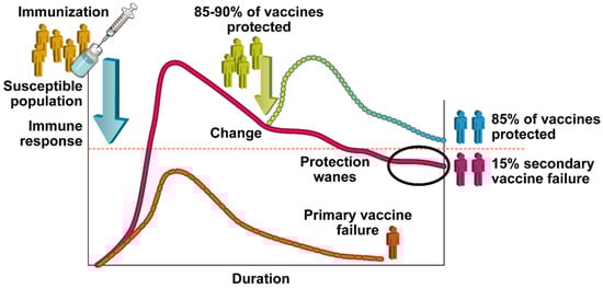 Primary failures, or vaccine non-responsiveness, occur when a vaccinated individual fails to produce an initial immune response to the vaccine []. An example of this classification is the Measles, Mumps, Rubella (MMR) vaccine, where vaccine non-responsiveness occurs in 2–10% of healthy individuals. While live-attenuated vaccines have a lower prevalence of primary vaccine failures, vaccine non-responsiveness occurs to some extent in every vaccine humans have created thus far [,].