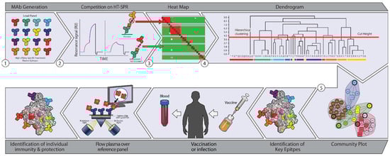 Epitope binning is currently being incorporated into some vaccination development processes [,,]. Serum from vaccinated subjects can be incubated and allowed to form complexes with the antigen of interest. The serum antibody–antigen complexes can then flow over a biosensor chip with printed monoclonal antibodies to known epitopes of the antigen []. Surface plasmon resonance (SPR) analysis of the biosensor chip can reveal whether or not each antibody pair binds competitively to the same epitope []. Figure 2 demonstrates the workflow. SPR analysis is beneficial as it uses very little sample, though in some cases, biolayer interferometry (BLI) detection may increase the number of analyzed analyte/ligand pairs []. These processes reveal the epitopes with which each sample’s antibodies interact. In vitro neutralization assays and animal studies can further elucidate which epitopes correlate with immune evasion by the pathogen of interest []. Vaccine design could then be enhanced by selecting the epitopes that confer the most robust immune protection.