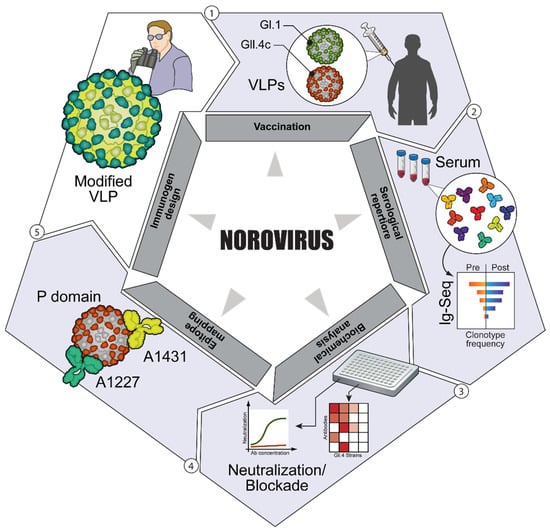 - Lindesmith, L.C.; McDaniel, J.R.; Changela, A.; Verardi, R.; Kerr, S.A.; Costantini, V.; Brewer-Jensen, P.D.; Mallory, M.L.; Voss, W.N.; Boutz, D.R.; et al. Sera Antibody Repertoire Analyses Reveal Mechanisms of Broad and Pandemic Strain Neutralizing Responses after Human Norovirus Vaccination. Immunity 2019, 50, 1530–1541.e8. [Google Scholar] [CrossRef]